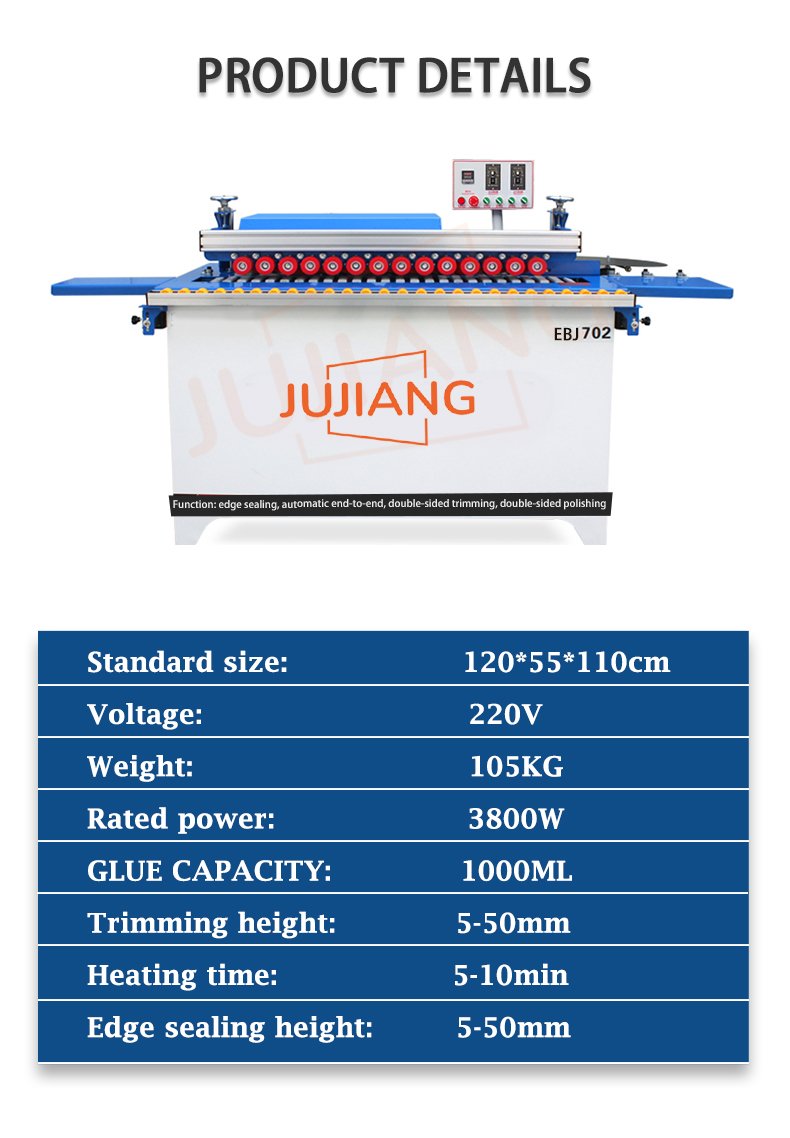 2. The EBJ702 Edge bander is fully functional and can automatically gluing trimming, end cutting, and buffing3. It uses an enlarged cylinder, and its maximum cutting thickness of edge banding reaches 3mm.